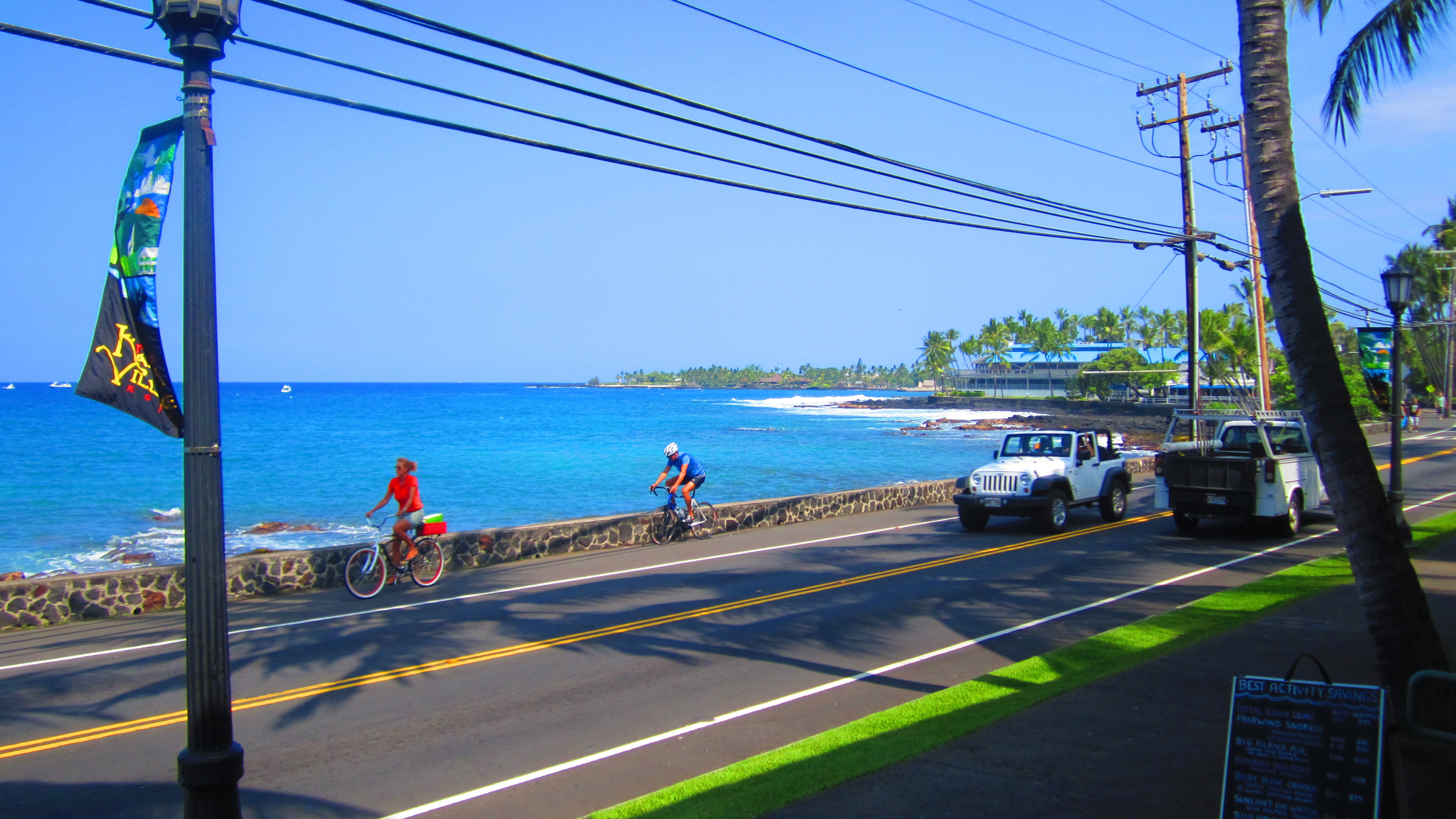 After happy hour, we packed it up to enjoy our night at the resort. We drove along Ali’i Drive, passing tourists and locals walking along the flower-laden street, surfers passing with their boards tucked under their arms while skateboarding. We saw the beautiful Magic Sands beach, a smallish stretch of beach great for surfing.