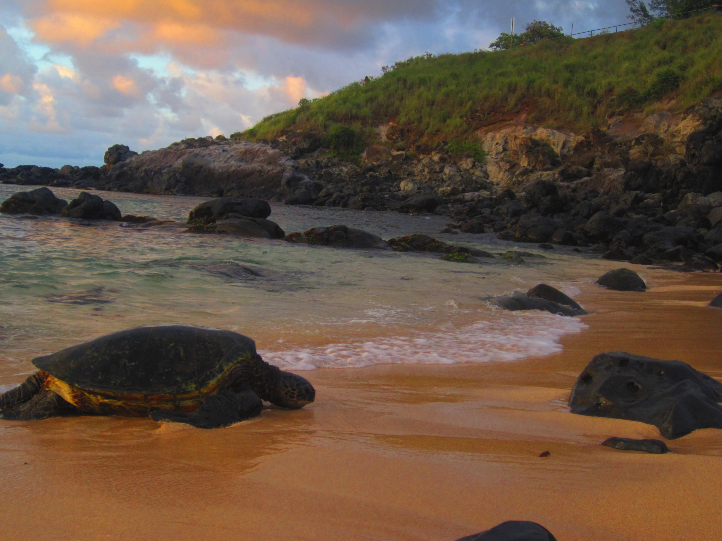 As I sat there and offered all of myself up to the island, watching the Pacific rolling in and the sun dipping into the clouds, eight large green sea turtles began to crawl onto shore. In Hawaii, honu, or turtles, are symbolic of good luck. As if answering my prayers for a sign that things will work out how they’re supposed to, almost ten turtles emerged from the sea onto the shore to “rest.”