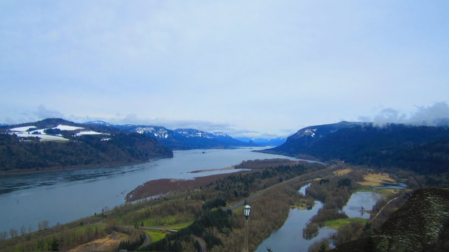 This is my first visit to the Pacific Northwest and I’m charmed at the scenery. Because of Oregon’s geographic location, snow, especially near Portland rarely falls. This day in March, the peaks of the gorge are dusted lightly with snow, making for a dramatic contrast to the gray sky.