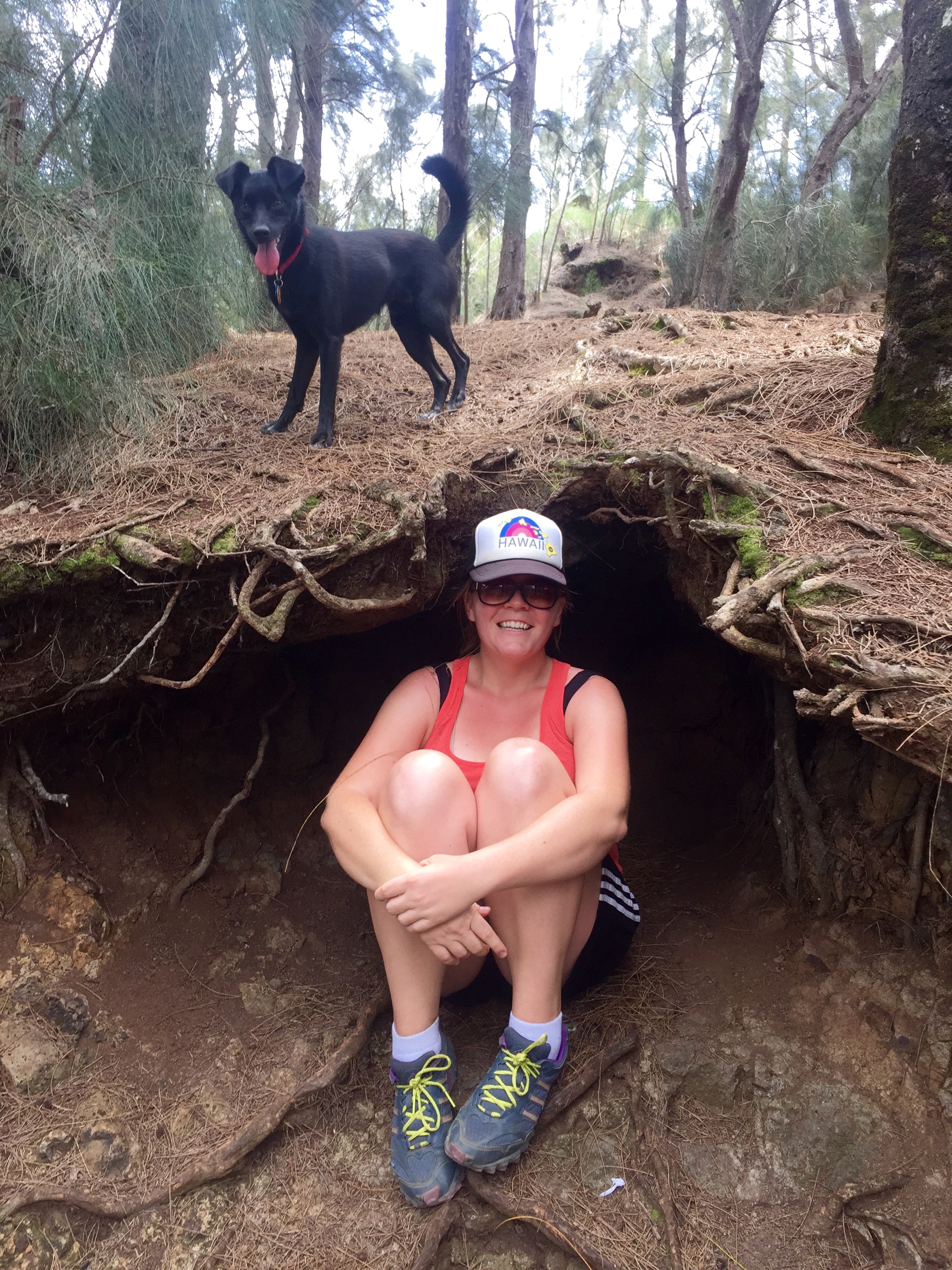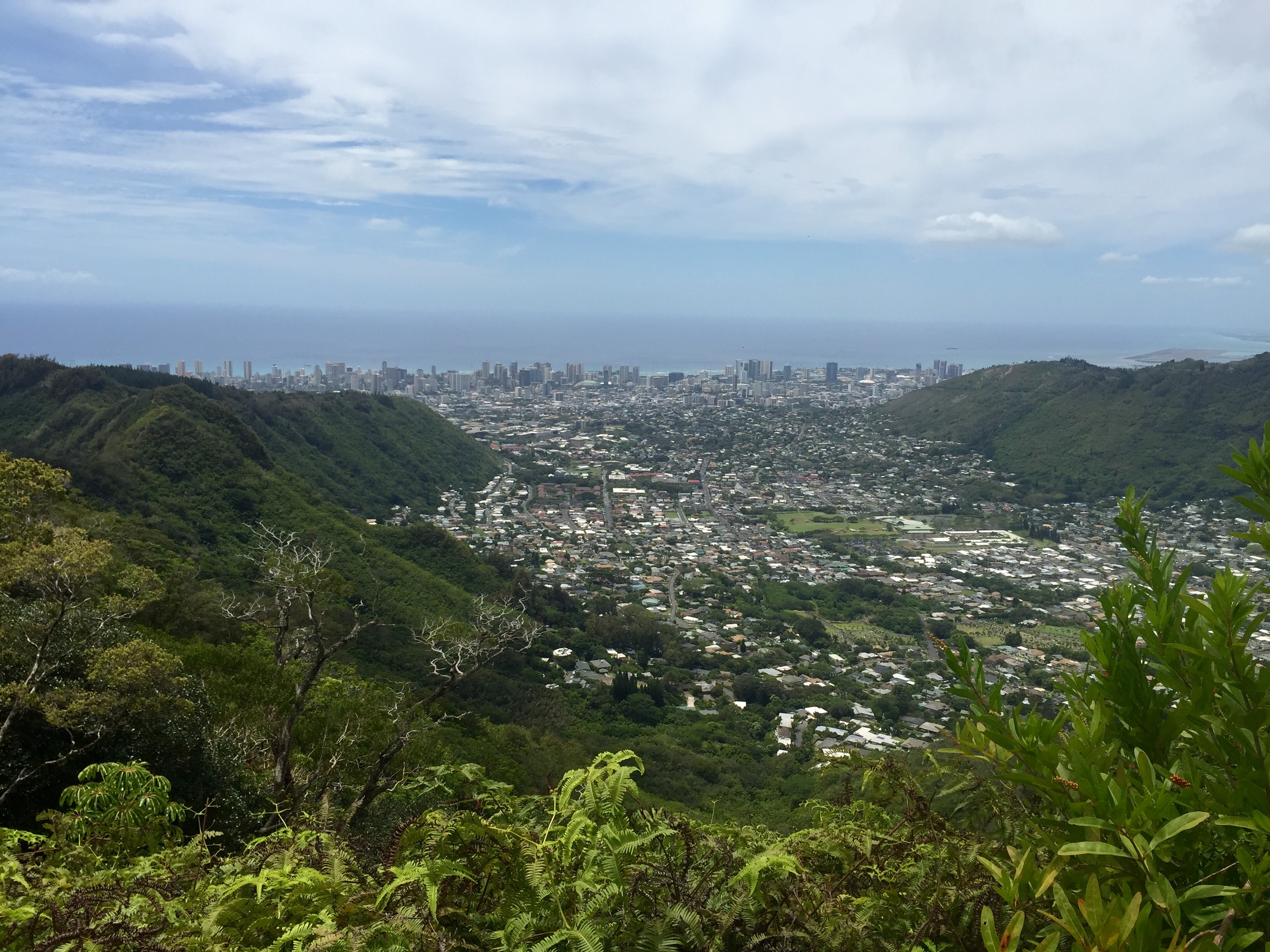 After taking a water break and posing in this cave, it was up we went. Just a mile further will lead you to a grassy clearing where you can bask in the glory of a hard-earned view of Honolulu and the Pacific Ocean.
