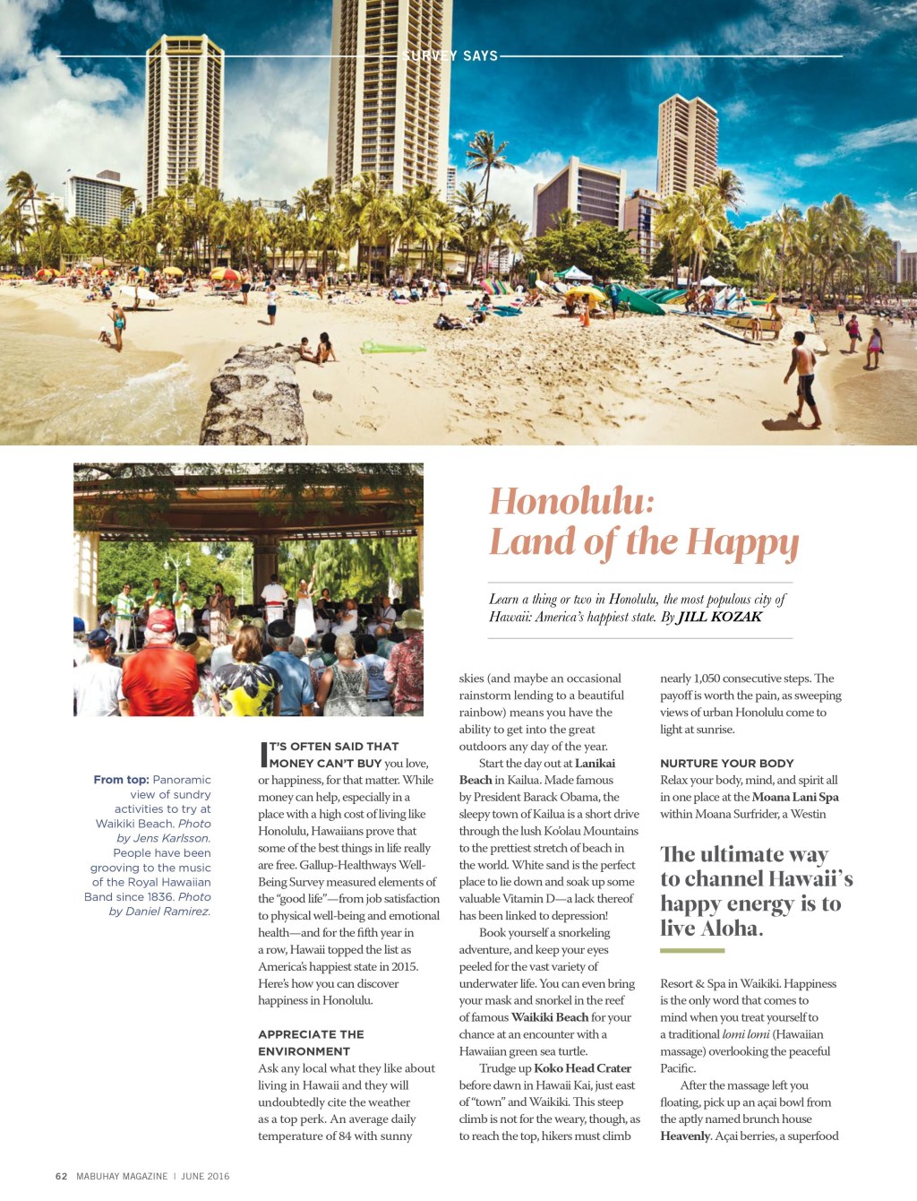 This is the June feature on Honolulu for Mabuhay Magazine, the Philippine Airlines in-flight magazine. “Honolulu: Land of the Happy” is meant to convey how happy life in Hawaii really is.